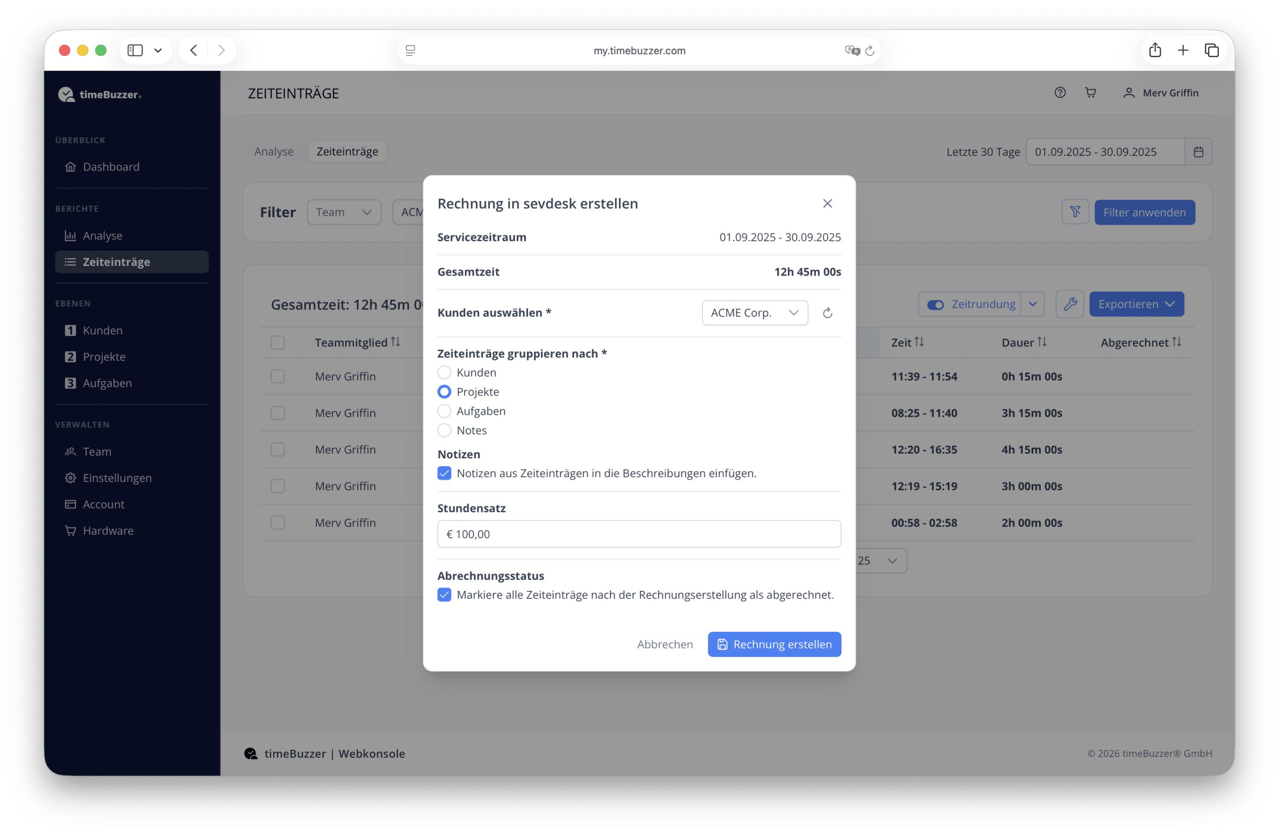 - sevdesk Rechnungen direkt aus erfassten Zeiteinträgen erstellen