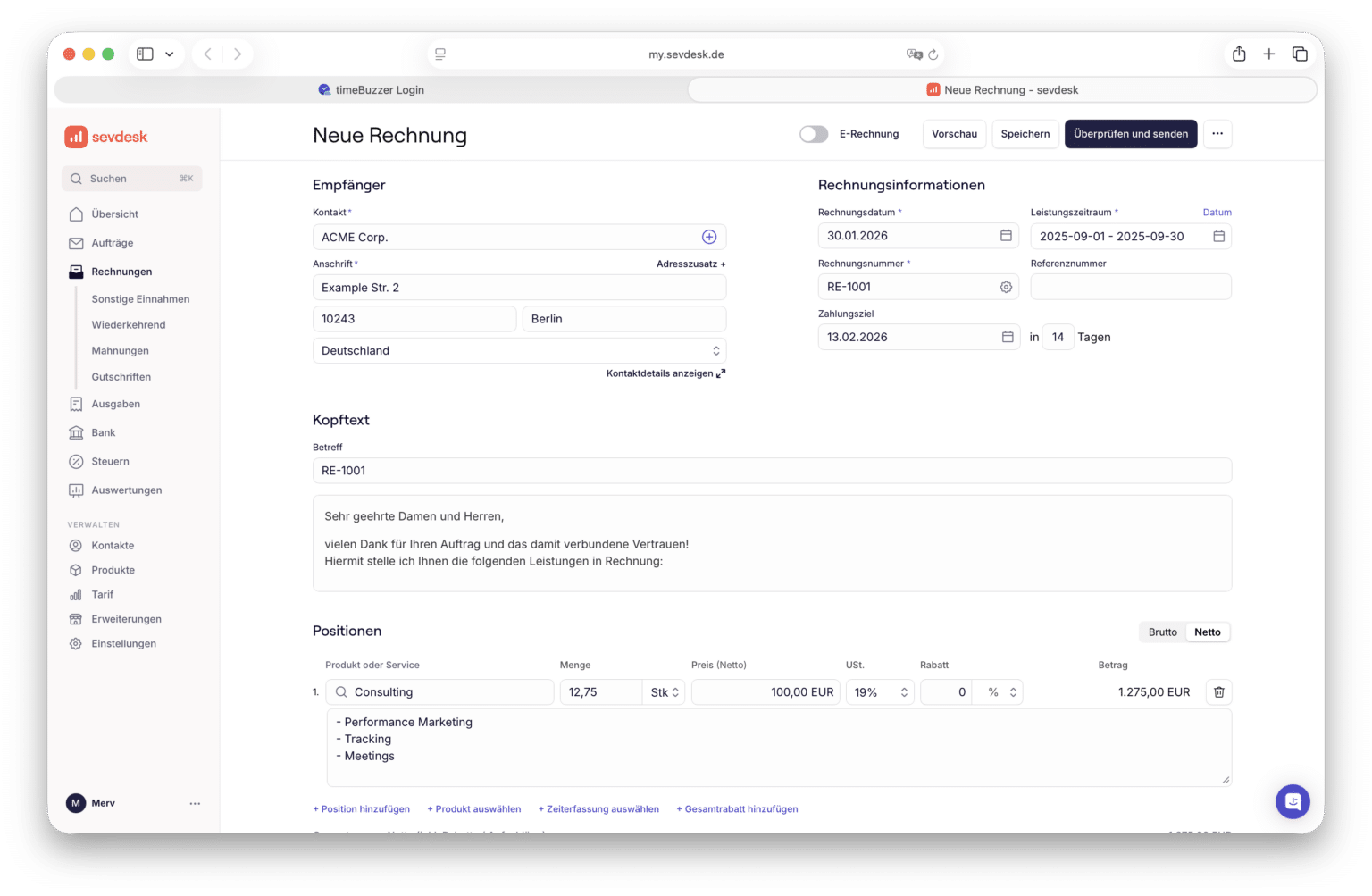 - Rechnung in sevdesk fertigstellen und absenden