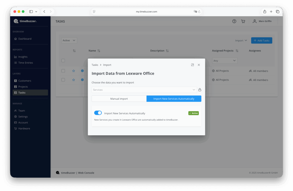 From now on, new services created in Lexware Office will automatically be displayed in timeBuzzer.