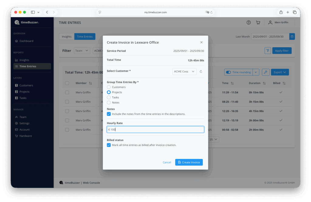 If you have different hourly rates for different positions, you can adjust this in the next step in the invoice in Lexware Office. - (Optional) Activate Mark as billed to automatically mark time entries after the invoice has been created.