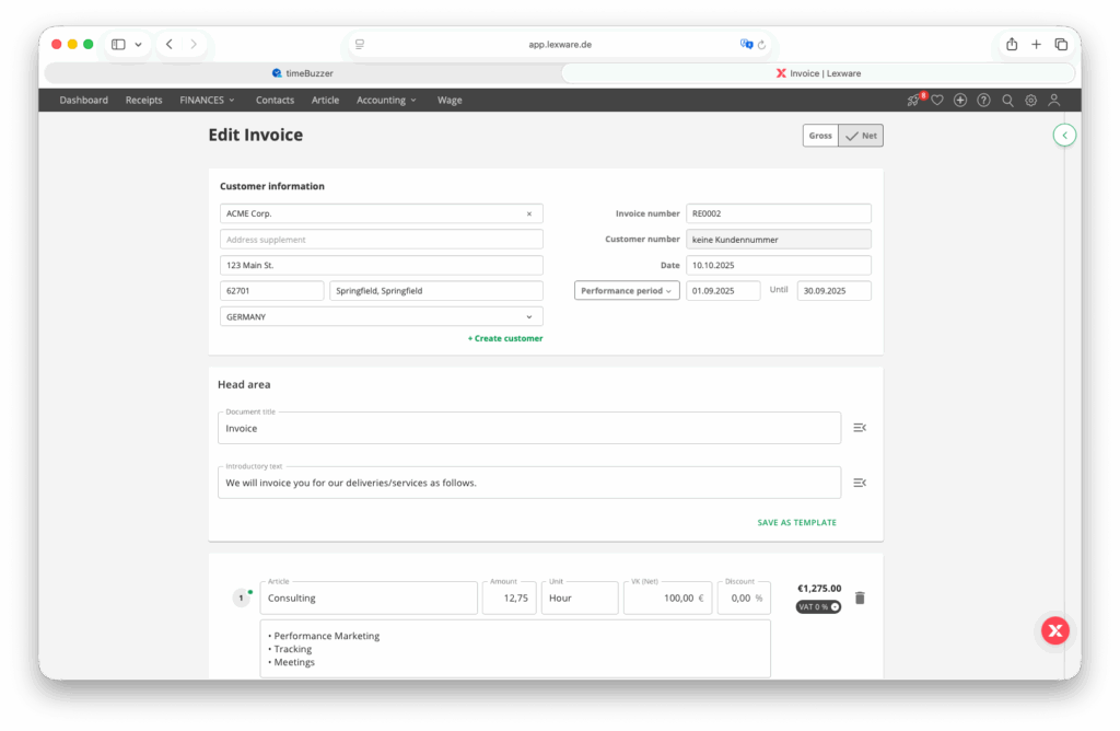 Create Lexware Office invoices directly in timeBuzzer #