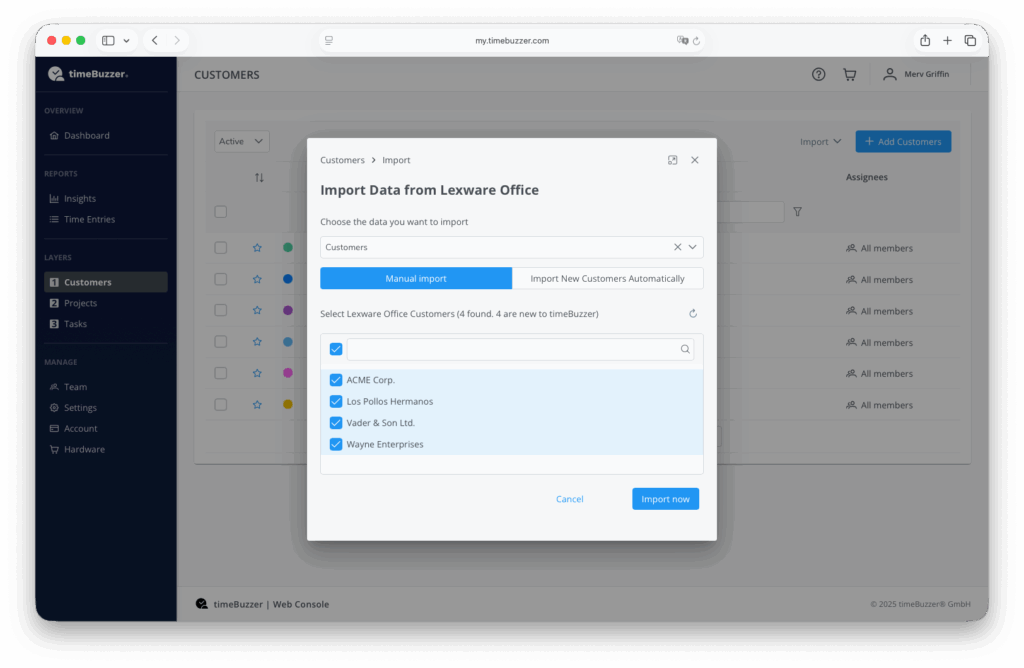 You can import Lexware Office customers into any timeBuzzer level.