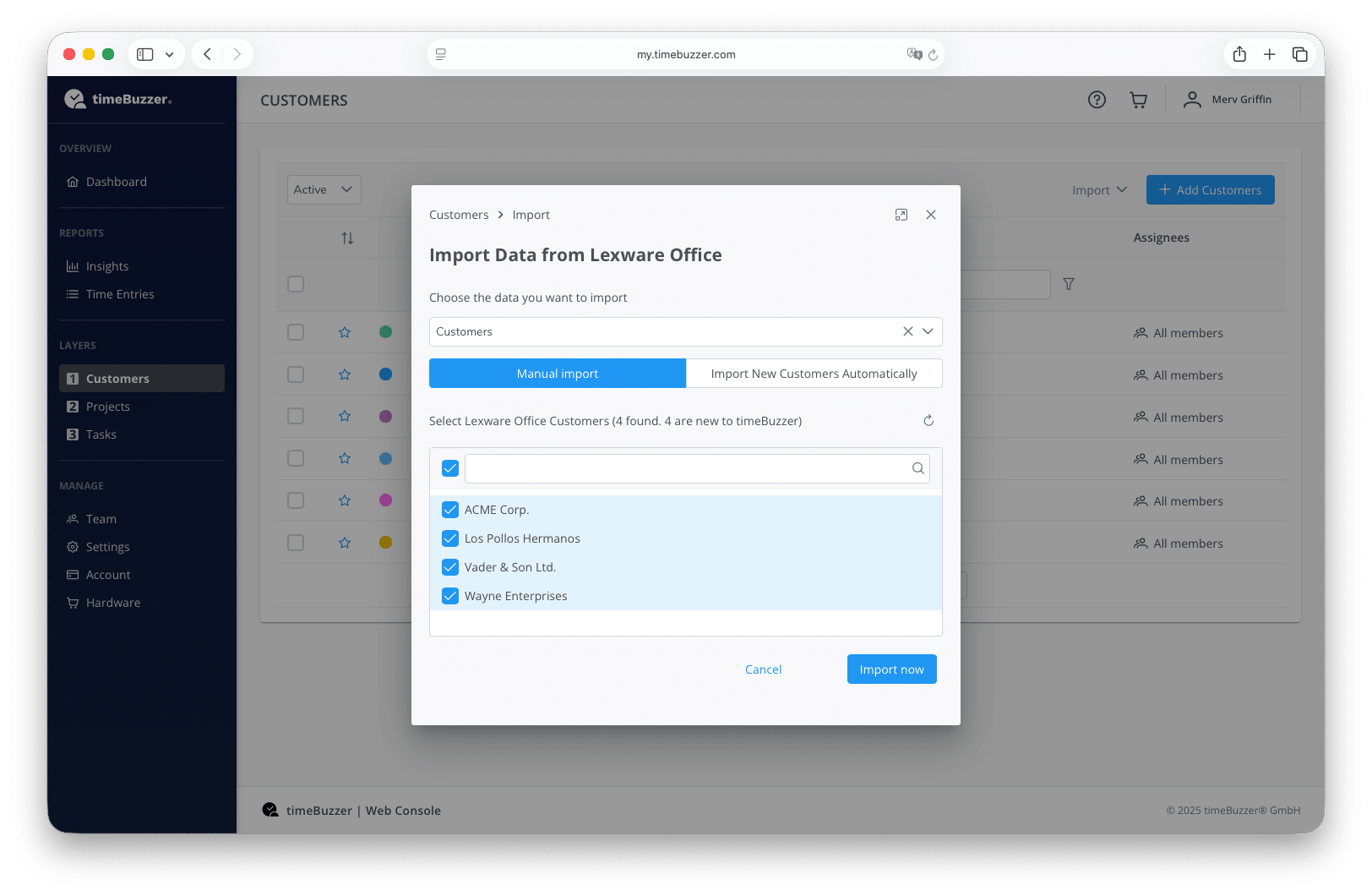 - Only new customers that do not yet exist in timeBuzzer are displayed. The system checks whether there are already customers with the same name.