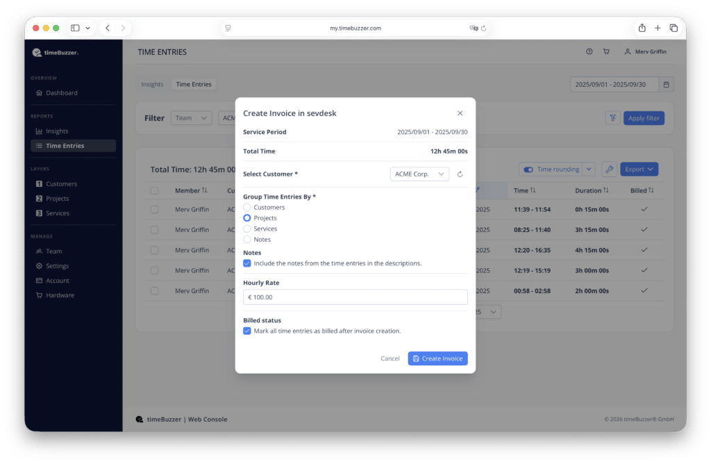 If you have different hourly rates for different positions, you can adjust this in the next step in the invoice in sevdesk. - (Optional) Activate Mark as billed to automatically mark time entries after the invoice has been created.