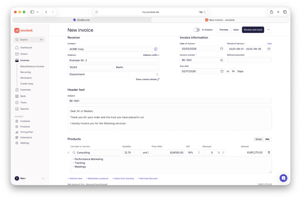 You need a timeBuzzer Pro account and a sevdesk account with a plan that supports partner integrations.