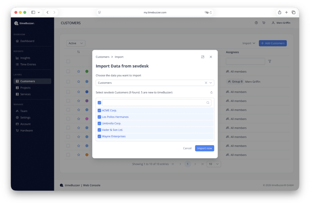 All contacts in sevdesk except “Suppliers” are available for import into timeBuzzer.