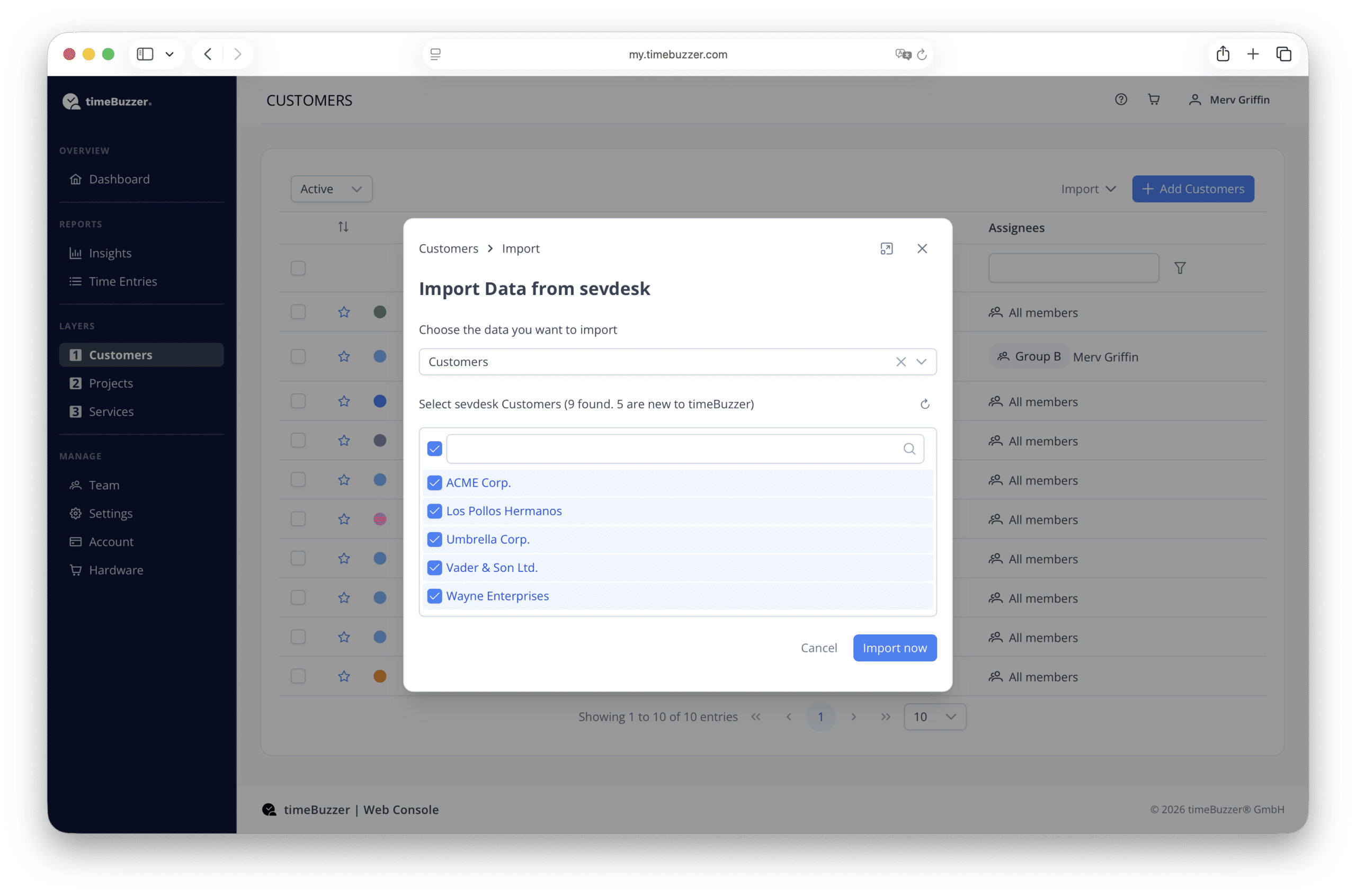 - Only new customers that do not yet exist in this layer in timeBuzzer are displayed. The system checks whether there are already customers with the same name. (Exact match)