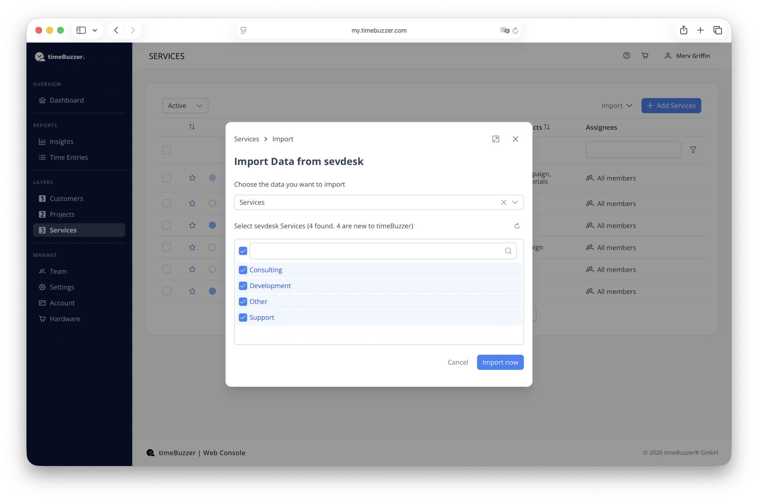 All proudcts in sevdesk that are categorized as service are available for import into timeBuzzer. Currently, only the names are transferred; hourly rates cannot be imported at this time.