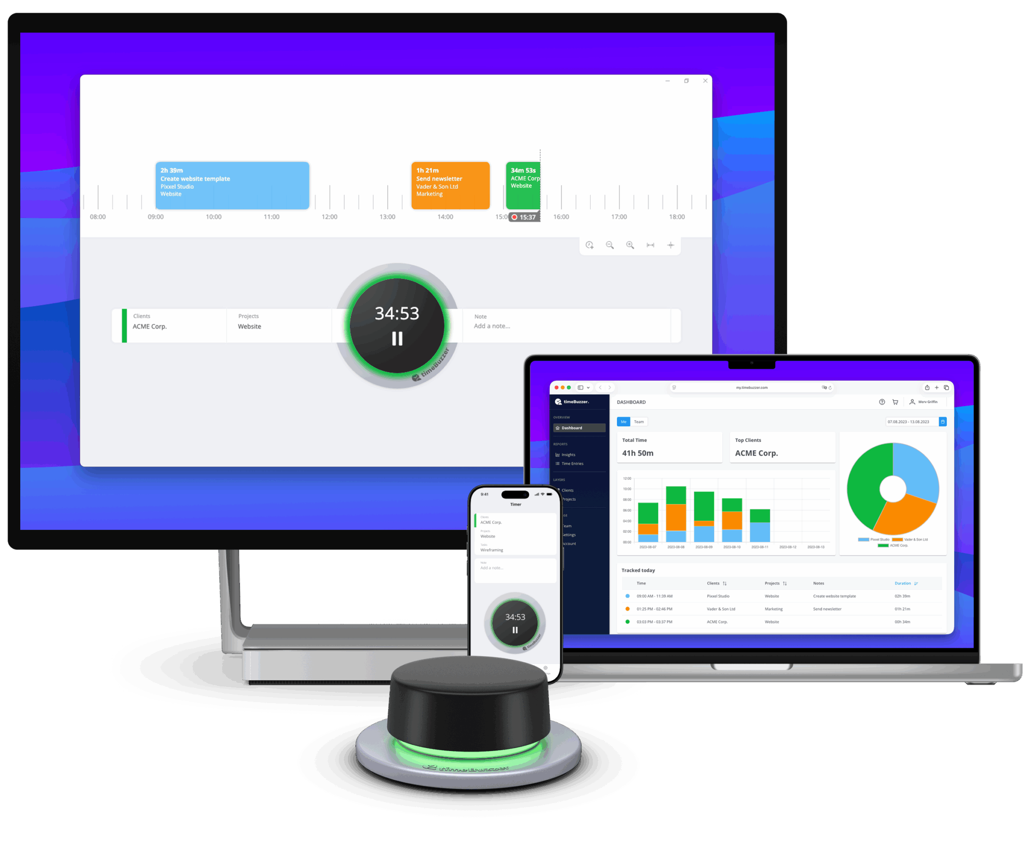 A physical button on the desk makes it especially easy to get used to, reminds you of time tracking, and allows you to record even very short activities.